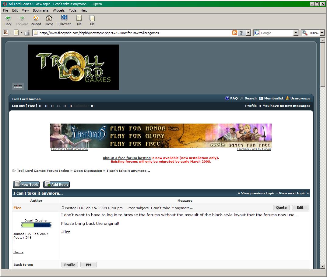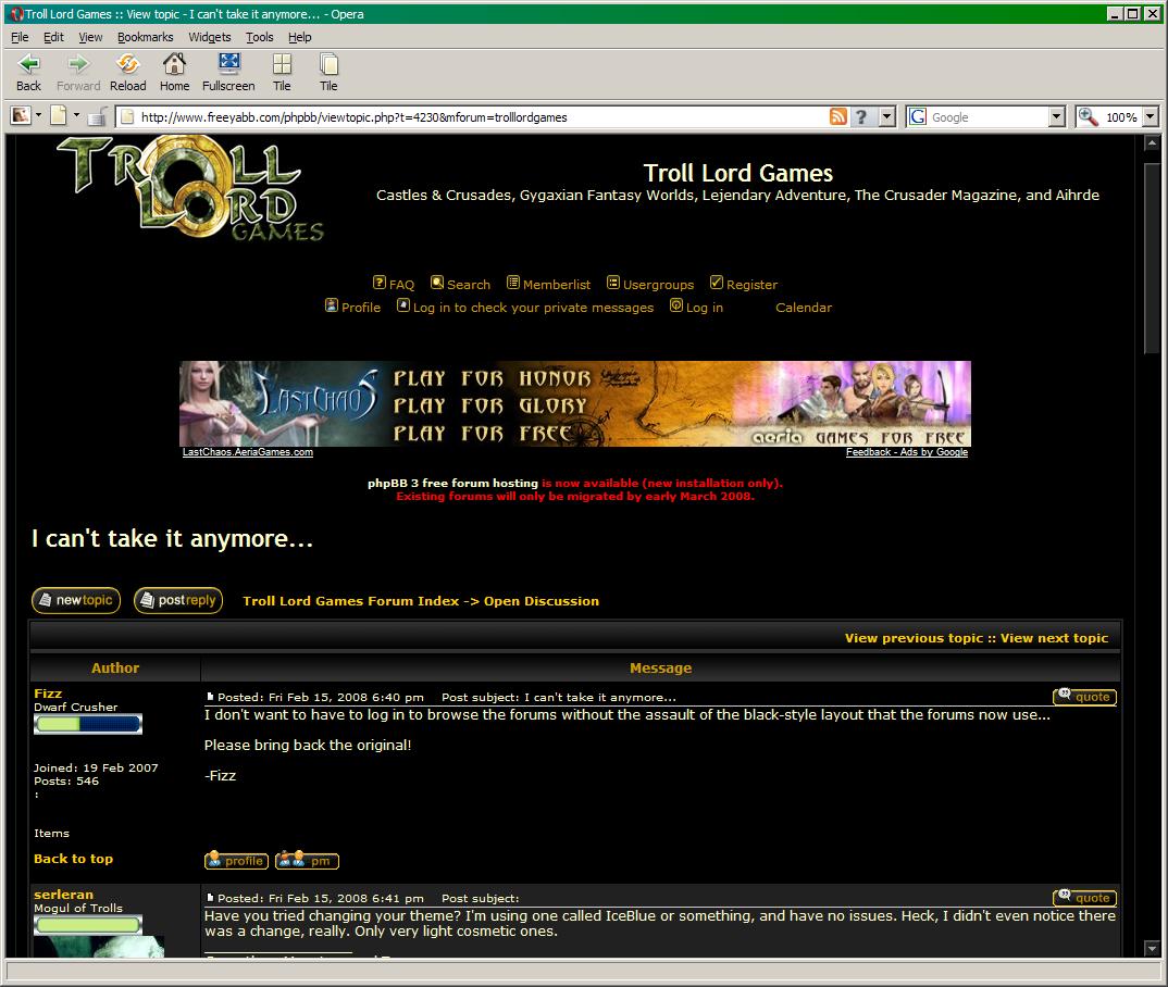 I never see the Troll Lord Games logo for some reason; doesn't matter whether I am logged in or logged out. In any case, I like the 'black' background...